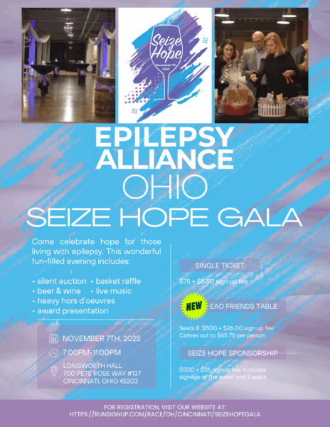 Join Epilepsy Alliance Ohio for the annual Seize Hope Gala at the historical Longworth Hall located at 700 Pete Rose Way #137, Cincinnati, Ohio 45203. This exciting evening will feature great company, beer & wine, and heavy hors d’oevres – all for a great cause! You will have the chance to bid on a vast array of silent auction items, basket raffles, enjoy live music, and celebrate with us as we toast to hope for those living with epilepsy every day.