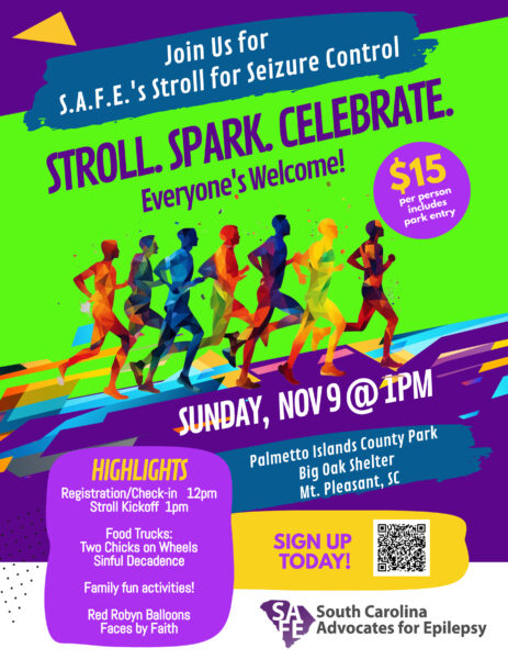 Join us for the 2025 Stroll for Seizure Control, a community walk dedicated to raising awareness and supporting people with epilepsy across South Carolina. This family-friendly event will be filled with fun and purpose — enjoy delicious eats from Two Chicks on Wheels and sweet treats from Sinful Indulgence, plus balloons, face painting, games, and activities for all ages. Together, we’ll walk, celebrate, and make a difference for epilepsy patients, caregivers, and families while supporting the mission of South Carolina Advocates For Epilepsy.